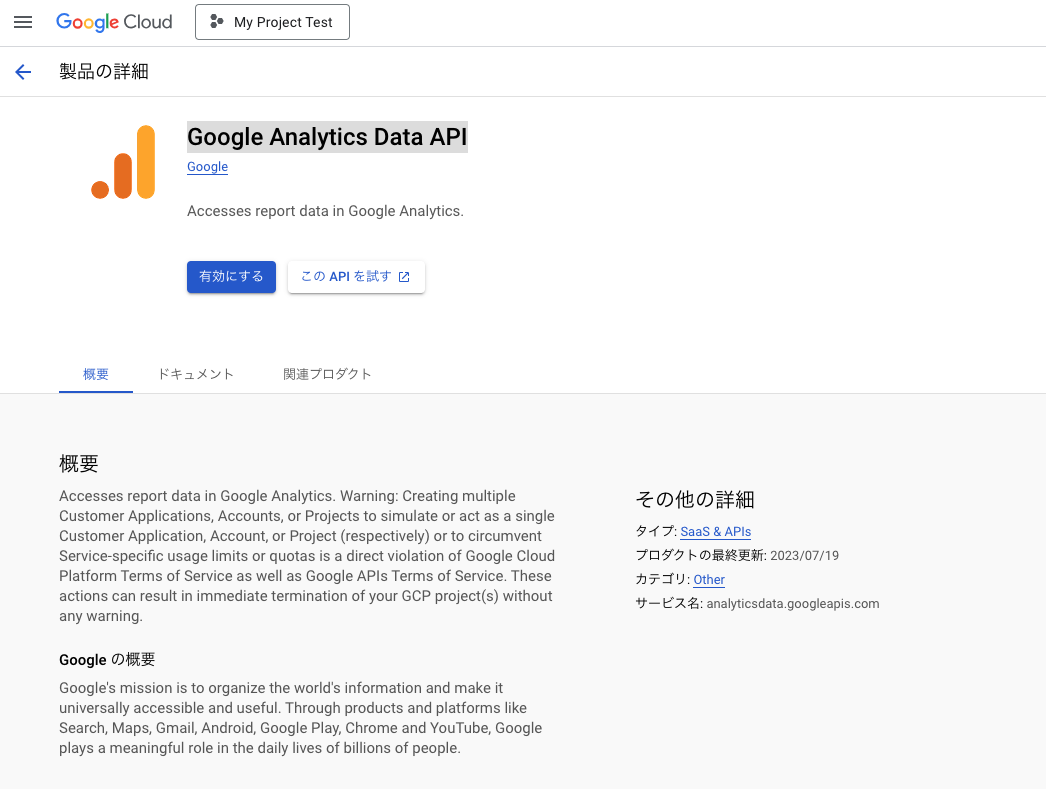 次に「Google Analytics Data API」を有効にします。