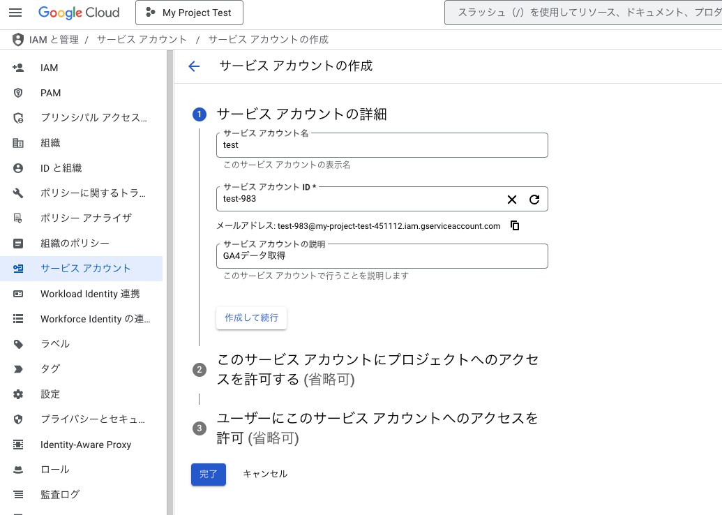 ①サービスアカウントの詳細を入力します。