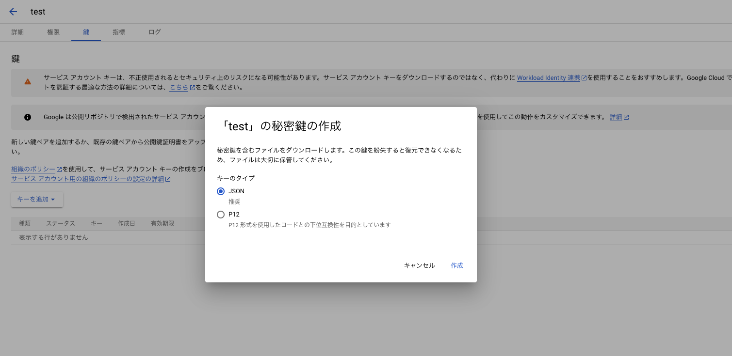 作成したサービスアカウントのJSONキーをダウンロードします。
